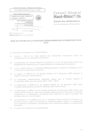 L’Assemblée Départementale, lors du vote du BP 2010, s’est prononcée pour l’inscription d’un crédit de 5 626 335 € pour la mise en œuvre de la politique départementale d’insertion, notamment en faveur des bénéficiaires du rSa, et a délégué à la Commission Permanente l’examen des demandes des contributions financières sollicitées dans ce cadre. Les actions proposées répondent aux perspectives de « l’appel à projets 2010 » porté, via le site internet du Conseil Général du Haut-Rhin, à la connaissance de l’ensemble des organismes intervenant dans le champ de l’insertion par l’activité économique ou en matière d’accompagnement social et/ou professionnel, ainsi qu’en matière d’accueil d’urgence. Le Conseil Général attribue également des aides à l’équipement aux structures qui accueillent des bénéficiaires du rSa. Cinq structures ont déposé une demande de financement à cette fin. Le montant total des subventions proposées dans ce rapport s’élève à : 5 389 817 €.