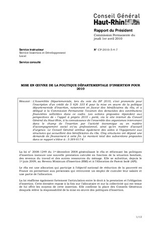 MISE EN ŒUVRE DE LA POLITIQUE DÉPARTEMENTALE D’INSERTION POUR 2010