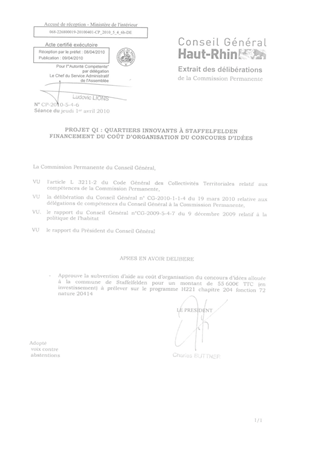 Dans le cadre de la procédure de concours d’idées pour les quartiers innovants, le Département prend en charge, sous forme de subventions aux collectivités, 80% du coût total d’organisation du concours dans la limite forfaitaire de 57 353 €. Il est proposé d’accorder la somme de 55 600€ TTC à la commune de STAFFELFELDEN qui a réuni son jury le 21 janvier 2010.