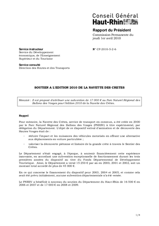 Il est proposé d'attribuer une subvention de 17 000 € au Parc Naturel Régional des Ballons des Vosges pour l'édition 2010 de la Navette des Crêtes.