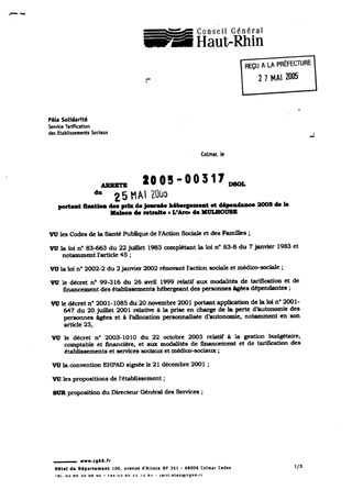 portant fixation des prix de journée hébergement et dépendance 2005 de la maison de retraite "L'Arc" de Mulhouse. Resumé Pièces jointes ARRETE Assemblée : Non défini Date : 25/05/2005 Rapporteur : Non défini Collectivité : Conseil départemental du Haut-Rhin Direction : Non défini Service : Service de la Tarification des Etablissements Domaine : Prix de Journée Commission :
