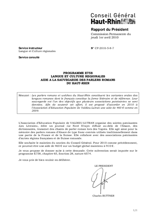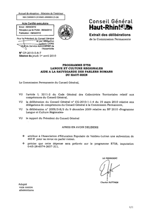 Les parlers romans et welches du Haut-Rhin constituent les variantes orales des langues romanes dont le français constitue la forme littéraire et de référence. Leur sauvegarde est l’un des objectifs que plusieurs associations patoisantes se sont données. Afin de soutenir cet effort, il est proposé d’accorder en 2010 à l’Association d’Education Populaire de Valdieu-Lutran une aide de 460 € comme en 2009.