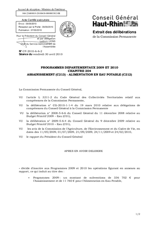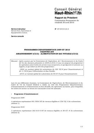 PROGRAMMES DEPARTEMENTAUX 2009 ET 2010 CHAPITRE 204 ASSAINISSEMENT (C213) - ALIMENTATION EN EAU POTABLE (C212)
