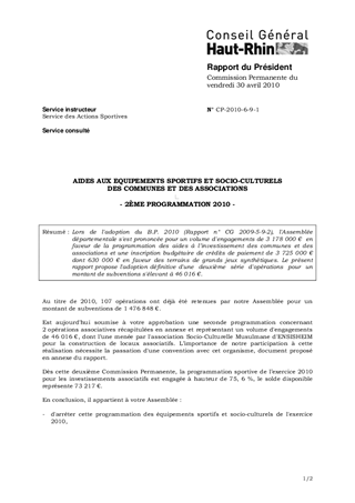 Lors de l'adoption du B.P. 2010 (Rapport n° CG 2009-5-9-2), l'Assemblée départementale s'est prononcée pour un volume d'engagements de 3 178 000 € en faveur de la programmation des aides à l’investissement des communes et des associations et une inscription budgétaire de crédits de paiement de 3 725 000 € dont 630 000 € en faveur des terrains de grands jeux synthétiques. Le présent rapport propose l'adoption définitive d'une deuxième série d'opérations pour un montant de subventions s'élevant à 46 016 €.