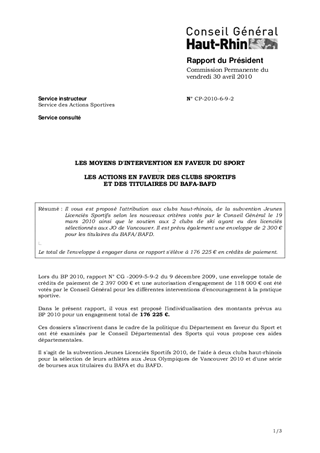 Il vous est proposé l'attribution aux clubs haut-rhinois, de la subvention Jeunes Licenciés Sportifs selon les nouveaux critères votés par le Conseil Général le 19 mars 2010 ainsi que le soutien aux 2 clubs de ski ayant eu des licenciés sélectionnés aux JO de Vancouver. Il est prévu également une enveloppe de 2 300 € pour les titulaires du BAFA/BAFD. Le total de l'enveloppe à engager dans ce rapport s'élève à 176 225 € en crédits de paiement.