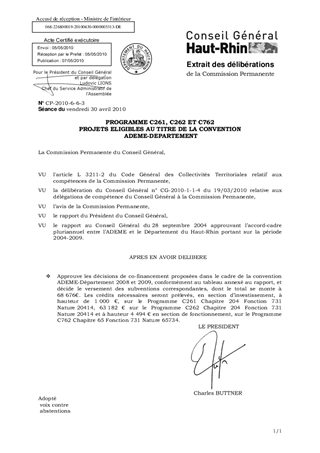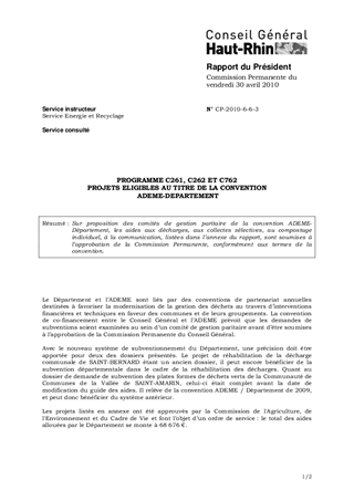 PROGRAMME C261, C262 ET C762 PROJETS ELIGIBLES AU TITRE DE LA CONVENTION ADEME-DEPARTEMENT
