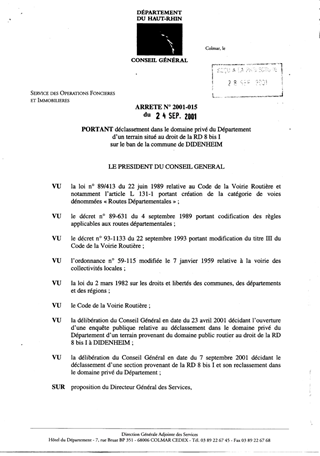 Portant déclassement dans le domaine privé du Département d'un terain situé au droit de la RD 8 bis I sur le ban de la commune de DIDENHEIM Resumé Pièces jointes ARRETE Assemblée : Non défini Date : 28/09/2001 Rapporteur : Non défini Collectivité : Conseil départemental du Haut-Rhin Direction : Non défini Service : Service du Patrimoine et du droit des Sols Domaine : Déclassement de voirie Commission :