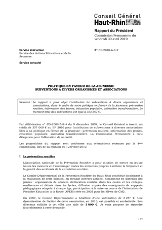 Le rapport a pour objet l'attribution de subventions à divers organismes et associations, dans le cadre de notre politique en faveur de la jeunesse: prévention routière, information des jeunes, éducation populaire, animation transfrontalière. Le montant total des subventions est égal à 353 567 €.