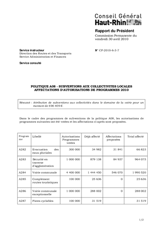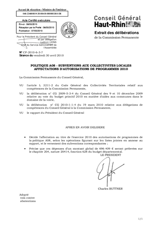POLITIQUE A08 - SUBVENTIONS AUX COLLECTIVITES LOCALES AFFECTATIONS D'AUTORISATIONS DE PROGRAMMES 2010
