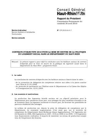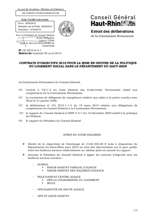 CONTRATS D'OBJECTIFS 2010 POUR LA MISE EN OEUVRE DE LA POLITIQUE DU LOGEMENT SOCIAL DANS LE DÉPARTEMENT DU HAUT-RHIN