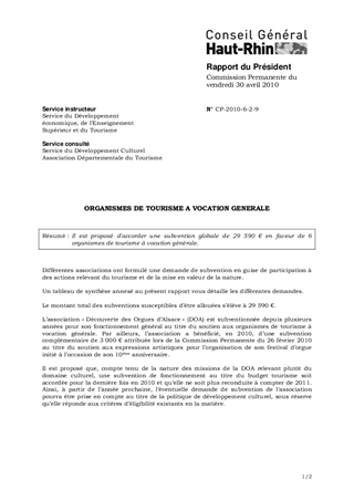 Il est proposé d'accorder une subvention globale de 29 590 € en faveur de 6 organismes de tourisme à vocation générale.