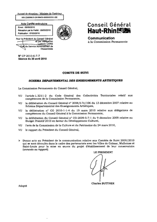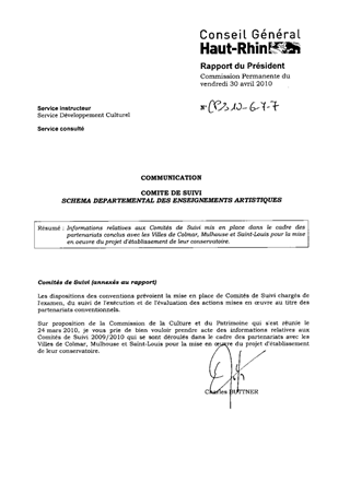 COMMUNICATION COMITE DE SUIVI SCHEMA DEPARTEMENTAL DES ENSEIGNEMENTS ARTISTIQUES Resumé Pièces jointes DELIBERATION RAPPORT Assemblée : Commission Permanente Date : 30/04/2010 Rapporteur : Non défini Collectivité : Conseil départemental du Haut-Rhin Direction : Non défini Service : Direction de la Culture et du Patrimoine Domaine : Culture Commission : Commission Permanente