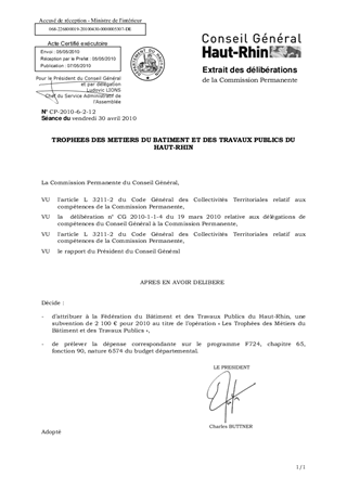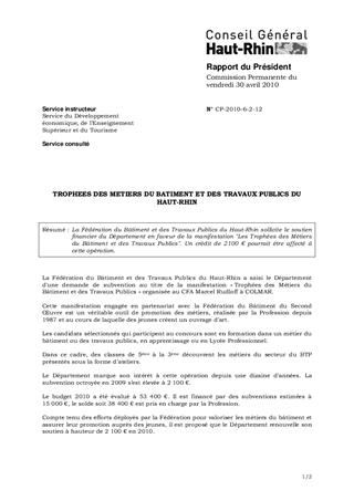 La Fédération du Bâtiment et des Travaux Publics du Haut-Rhin sollicite le soutien financier du Département en faveur de la manifestation "Les Trophées des Métiers du Bâtiment et des Travaux Publics". Un crédit de 2100 € pourrait être affecté à cette opération.