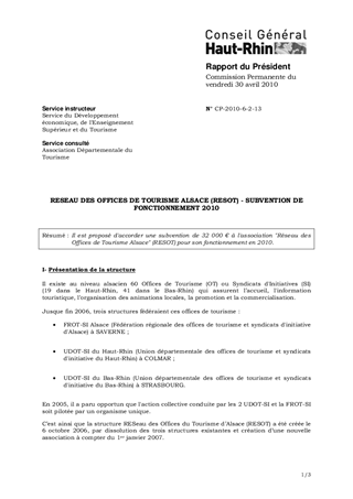 RESEAU DES OFFICES DE TOURISME ALSACE (RESOT) - SUBVENTION DE FONCTIONNEMENT 2010