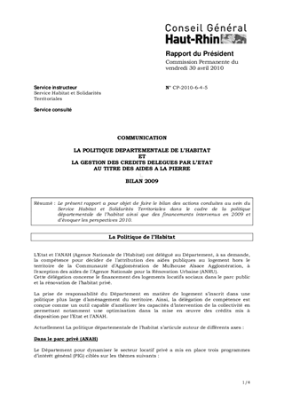 Le présent rapport a pour objet de faire le bilan des actions conduites au sein du Service Habitat et Solidarités Territoriales dans le cadre de la politique départementale de l'habitat ainsi que des financements intervenus en 2009 et d'évoquer les perspectives 2010.