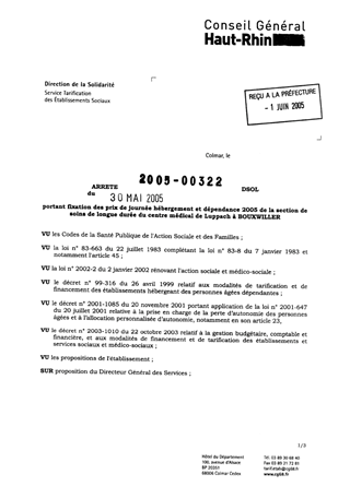 portant fixation des prix de journée hébergement et dépendance 2005 de la section de soins de longue durée du centre médical de Luppach à Bouxwiller. Resumé Pièces jointes ARRETE Assemblée : Non défini Date : 30/05/2005 Rapporteur : Non défini Collectivité : Conseil départemental du Haut-Rhin Direction : Non défini Service : Service de la Tarification des Etablissements Domaine : Prix de Journée Commission :