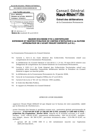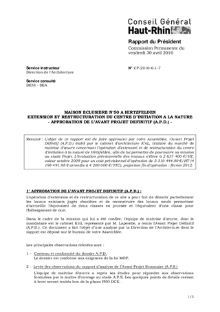 L'objet de ce rapport est de faire approuver par votre Assemblée, l'Avant Projet Définitif (A.P.D.) établi par le cabinet d'architecture K'nL, titulaire du marché de maîtrise d’oeuvre concernant l'opération d'extension et de restructuration du centre d'initiation à la nature de Hirtzfelden, afin de lui permettre de poursuivre sa mission au stade Projet. L'évaluation prévisionnelle des travaux s'élève à 2 637 400 €/HT, valeur octobre 2009 pour un coût prévisionnel d'opération de 3 510 444.80 €/HT (4 198 491.98 € arrondis à 4 200 000 €/TTC), projection fin d'opération : février 2012.
