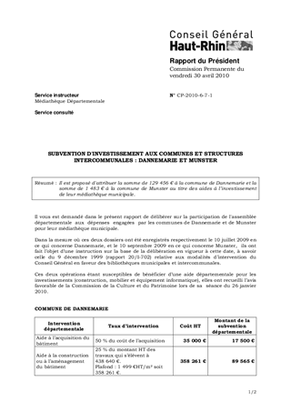 Il est proposé d'attribuer la somme de 129 456 € à la commune de Dannemarie et la somme de 1 483 € à la commune de Munster au titre des aides à l’investissement de leur médiathèque municipale.