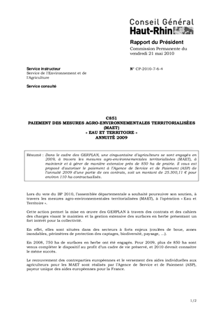 C851 PAIEMENT DES MESURES AGRO-ENVIRONNEMENTALES TERRITORIALISÉES (MAET) « EAU ET TERRITOIRE » ANNUITÉ 2009