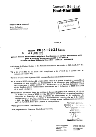 portant fixation de la dotation globale de fonctionnement au titre de l'exercice 2005 pour le service d'accompagnement à la vie sociale de l'Institut pour déficients sensoriels "Le Phare" à Illzach. Resumé Pièces jointes ARRETE Assemblée : Non défini Date : 01/06/2005 Rapporteur : Non défini Collectivité : Conseil départemental du Haut-Rhin Direction : Non défini Service : Service de la Tarification des Etablissements Domaine : Dotations financières Commission :
