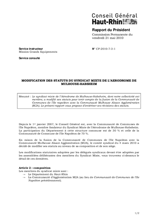 Le syndicat mixte de l'Aérodrome de Mulhouse-Habsheim, dont notre collectivité est membre, a modifié ses statuts pour tenir compte de la fusion de la Communauté de Communes de l'Ile napoléon avec la Communauté Mulhouse Alsace Agglomération (M2A). Le présent rapport vous propose d'entériner ces révisions des statuts.