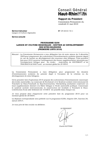La Commission Permanente a reçu délégation lors de notre séance du 9 décembre 2009 pour programmer des subventions d'investissements scolaires (premier degré) en vue du soutien au développement des nouveaux sites bilingues. Cette première liste pour 2010 concerne l'aménagement des locaux supplémentaires nécessités par l'enseignement bilingue pour les écoles maternelles de SOUTZMATT et de TRAUBACH LE HAUT avec un montant global de 20 000 €.