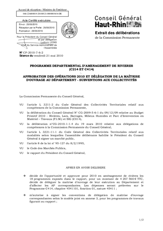 PROGRAMME DEPARTEMENTAL D'AMENAGEMENT DE RIVIERES (C214 ET C414) APPROBATION DES OPÉRATIONS 2010 ET DÉLÉGATION DE LA MAÎTRISE D'OUVRAGE AU DÉPARTEMENT - SUBVENTIONS AUX COLLECTIVITÉS