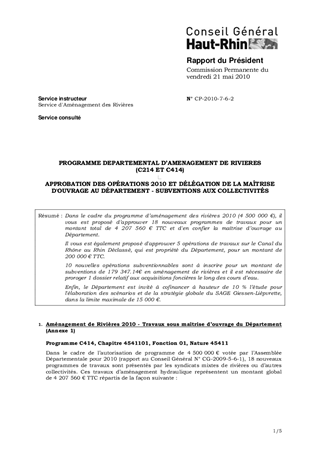 Dans le cadre du programme d'aménagement des rivières 2010 (4 500 000 €), il vous est proposé d'approuver 18 nouveaux programmes de travaux pour un montant total de 4 207 560 € TTC et d'en confier la maîtrise d'ouvrage au Département. Il vous est également proposé d'approuver 5 opérations de travaux sur le Canal du Rhône au Rhin Déclassé, qui est propriété du Département, pour un montant de 200 000 € TTC. 10 nouvelles opérations subventionnables sont à inscrire pour un montant de subventions de 179 347.14€ en aménagement de rivières et il est nécessaire de proroger 1 dossier relatif aux acquisitions foncières le long des cours d’eau. Enfin, le Département est invité à cofinancer à hauteur de 10 % l'étude pour l'élaboration des scénarios et de la stratégie globale du SAGE Giessen-Lièpvrette, dans la limite maximale de 15 000 €.