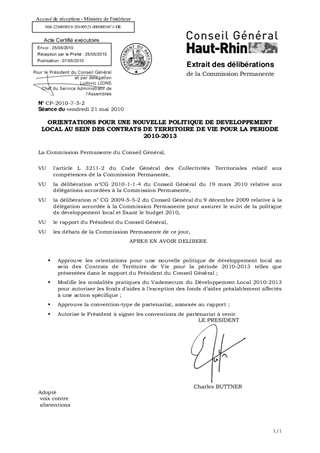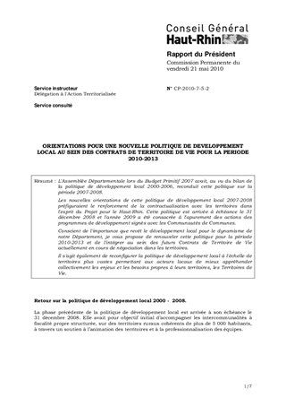 L'Assemblée Départementale lors du Budget Primitif 2007 avait, au vu du bilan de la politique de développement local 2000-2006, reconduit cette politique sur la période 2007-2008. Les nouvelles orientations de cette politique de développement local 2007-2008 préfiguraient le renforcement de la contractualisation avec les territoires dans l'esprit du Projet pour le Haut-Rhin. Cette politique est arrivée à échéance le 31 décembre 2008 et l'année 2009 a été consacrée à l'apurement des actions des programmes de développement signés avec les Communautés de Communes. Conscient de l'importance que revêt le développement local pour le dynamisme de notre Département, je vous propose de renouveler cette politique pour la période 2010-2013 et de l'intégrer au sein des futurs Contrats de Territoire de Vie actuellement en cours de négociation dans les territoires. Il s'agit également de reconfigurer la politique de développement local à l'échelle de territoires plus vastes permettant aux acteurs locaux de mieux appréhender collectivement les enjeux et les besoins propres à leurs territoires, les Territoires de Vie.