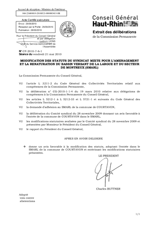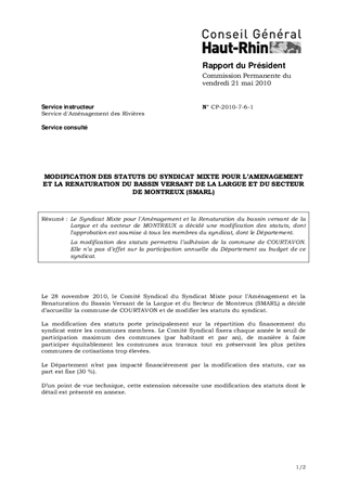 Le Syndicat Mixte pour l'Aménagement et la Renaturation du bassin versant de la Largue et du secteur de MONTREUX a décidé une modification des statuts, dont l'approbation est soumise à tous les membres du syndicat, dont le Département. La modification des statuts permettra l'adhésion de la commune de COURTAVON. Elle n'a pas d'effet sur la participation annuelle du Département au budget de ce syndicat.