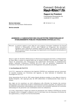 Le présent rapport a pour objet de vous proposer d’accepter l’adhésion du Conseil Général à l’association A.C.T.U. dont l’objectif est d’organiser des rencontres régulières entre utilisateurs CIVITAS, logiciel de gestion des ressources humaines, afin de le faire évoluer, de partager les expériences et de bénéficier de formations à tarif préférentiel.