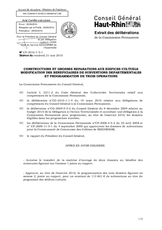 Transfert de maîtrise d'ouvrage suite à la dissolution de la Communauté de Communes des Collines de RIEDISHEIM pour cinq dossiers édifices cultuels et programmation de trois de ces aides au titre du programme 2010 des édifices cultuels pour un montant de 113 601 €.