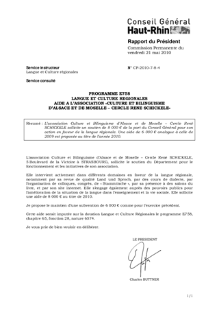 PROGRAMME E758 LANGUE ET CULTURE REGIONALES AIDE A L'ASSOCIATION "CULTURE ET BILINGUISME D'ALSACE ET DE MOSELLE - CERCLE RENE SCHICKELE"