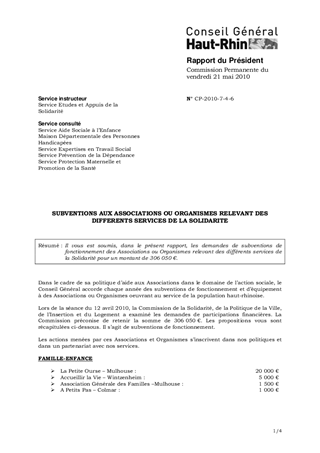 Il vous est soumis, dans le présent rapport, les demandes de subventions de fonctionnement des Associations ou Organismes relevant des différents services de la Solidarité pour un montant de 306 050 €.