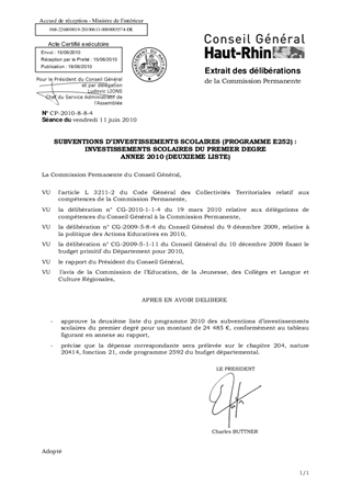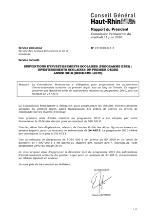 SUBVENTIONS D'INVESTISSEMENTS SCOLAIRES (PROGRAMME E252) : INVESTISSEMENTS SCOLAIRES DU PREMIER DEGRE ANNEE 2010 (DEUXIEME LISTE)