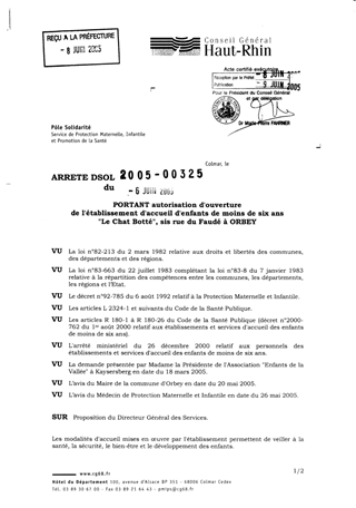 portant autorisation d'ouverture de l'établissement d'accueil d'enfants de moins de six ans "Le Chat Botté", sis rue du Faudé à Orbey. Resumé Pièces jointes ARRETE Assemblée : Non défini Date : 06/06/2005 Rapporteur : Non défini Collectivité : Conseil départemental du Haut-Rhin Direction : Non défini Service : Service de Protection Maternelle et Infantile Domaine : Accueil d'enfants Commission :