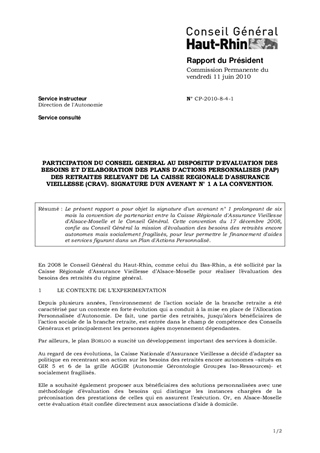 Le présent rapport a pour objet la signature d'un avenant n° 1 prolongeant de six mois la convention de partenariat entre la Caisse Régionale d'Assurance Vieillesse d'Alsace-Moselle et le Conseil Général. Cette convention du 17 décembre 2008, confie au Conseil Général la mission d'évaluation des besoins des retraités encore autonomes mais socialement fragilisés, pour leur permettre le financement d'aides et services figurant dans un Plan d'Actions Personnalisé.