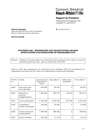 POLITIQUE A08 - SUBVENTIONS AUX COLLECTIVITES LOCALES AFFECTATIONS D'AUTORISATIONS DE PROGRAMME 2010