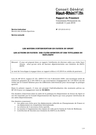 Il vous est proposé dans ce rapport, l'attribution de diverses aides aux clubs haut-rhinois, ainsi qu'une série de bourses départementales aux titulaires du BAFA-BAFD. Le total de l'enveloppe à engager dans ce rapport s'élève à 43 200 € en crédits de paiement.