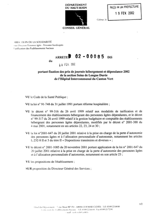 Portant fixation des prix de journée hébergement et dépendance 2002 de la section soins de longue durée de l'hôpital intercommunal du Canton Vert Resumé Pièces jointes ARRETE Assemblée : Non défini Date : 18/02/2002 Rapporteur : Non défini Collectivité : Conseil départemental du Haut-Rhin Direction : Non défini Service : Service de la Tarification des Etablissements Domaine : Prix de Journée Commission :