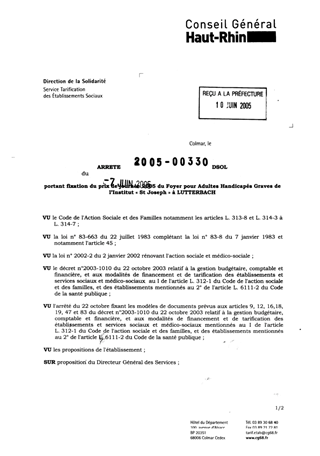 portant fixation du prix de journée 2005 du foyer pour adultes handicapés graves de l'Institut "St Joseph" à LUTTERBACH. Resumé Pièces jointes ARRETE Assemblée : Non défini Date : 07/06/2005 Rapporteur : Non défini Collectivité : Conseil départemental du Haut-Rhin Direction : Non défini Service : Service de la Tarification des Etablissements Domaine : Organisation Interne Commission :