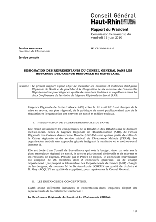 Le présent rapport a pour objet de présenter les missions et instances de l'Agence Régionale de Santé et de procéder à la désignation de six membres de l'Assemblée Départementale pour siéger en qualité de membres titulaires et suppléants dans les deux Conférences de Territoire de l'Agence Régionale de Santé (ARS).