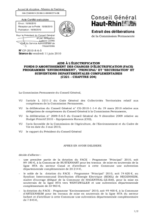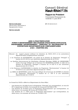 Ce rapport propose d'allouer les dotations du FACE 2010 et les subventions départementales complémentaires suivantes: - à la Commune de RUSTENHART, une partie de la dotation du Programme "Principal" à hauteur de 89 180 € et une subvention départementale de 20 214 €, - au Syndicat Intercommunal de Distribution d'Energie Electrique (SIDEL) de HEGENHEIM, maître d'ouvrage délégué de la Commune de HAGENTHAL-LE-BAS, le solde de la dotation du Programme "Principal" à hauteur de 74 620 € et une subvention départementale de 33 903 €, - à la Commune d'ARTZENHEIM, la dotation du Programme "Environnement" à hauteur de 49 400 € et une subvention départementale de 7 845 €, - au SIDEL de HEGENHEIM, maître d'ouvrage délégué de la Commune de LEYMEN, la dotation du Programme "Sécurisation" à hauteur de 11 700 € et une subvention départementale de 13 035 €.