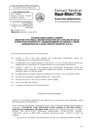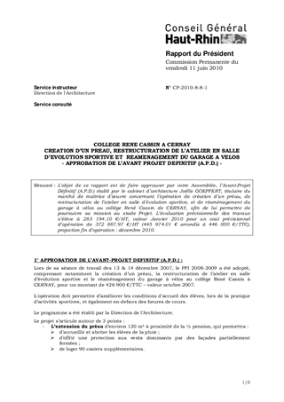 L'objet de ce rapport est de faire approuver par votre Assemblée, l'Avant-Projet Définitif (A.P.D.) établi par le cabinet d'architecture Joëlle GOEPFERT, titulaire du marché de maîtrise d'oeuvre concernant l'opération de création d'un préau, de restructuration de l'atelier en salle d'évolution sportive, et de réaménagement du garage à vélos au collège René Cassin de CERNAY, afin de lui permettre de poursuivre sa mission au stade Projet. L'évaluation prévisionnelle des travaux s'élève à 283 194.10 €/HT, valeur Janvier 2010 pour un coût prévisionnel d'opération de 372 887.97 €/HT (445 974.01 € arrondis à 446 000 €/TTC), projection fin d'opération : décembre 2010.