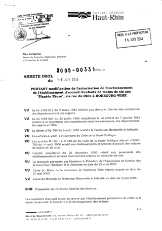 portant modification de l'autorisation de fonctionnement de l'établissement d'accueil d'enfants de moins de six ans "Planète Récré", sis rue du Rhin à HORBOURG-WIHR. Resumé Pièces jointes ARRETE Assemblée : Non défini Date : 08/06/2005 Rapporteur : Non défini Collectivité : Conseil départemental du Haut-Rhin Direction : Non défini Service : Service de Protection Maternelle et Infantile Domaine : Accueil d'enfants Commission :