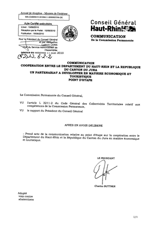 COMMUNICATIONCOOPERATION ENTRE LE DEPARTEMENT DU HAUT-RHIN ET LA REPUBLIQUE DU CANTON DU JURAUN PARTENARIAT A DEVELOPPER EN MATIERE ECONOMIQUE ET TOURISTIQUEPOINT D'ETAPE
