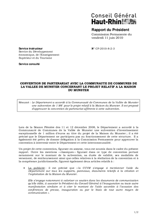 Le Département a accordé à la Communauté de Communes de la Vallée de Munster une subvention de 1 M€ pour le projet relatif à la Maison du Munster. Il est proposé d'approuver la convention de partenariat afférente à cette subvention.