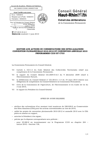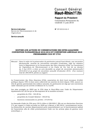 SOUTIEN AUX ACTIONS DU CONSERVATOIRE DES SITES ALSACIENS CONVENTION PLURIANNUELLE 2010-2012 ET CONVENTION ANNUELLE 2010 PROGRAMMES C233 ET C733