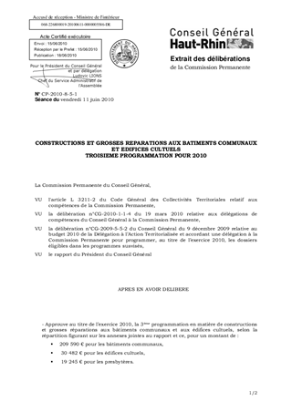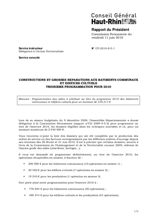 CONSTRUCTIONS ET GROSSES REPARATIONS AUX BATIMENTS COMMUNAUX ET EDIFICES CULTUELS TROISIEME PROGRAMMATION POUR 2010