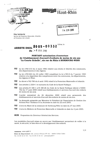 portant autorisation d'ouverture de l'établissement d'accueil d'enfants de moins de six ans "La Courte Echelle", sis rue du Rhin à HORBOURG-WIHR. Resumé Pièces jointes ARRETE Assemblée : Non défini Date : 08/06/2005 Rapporteur : Non défini Collectivité : Conseil départemental du Haut-Rhin Direction : Non défini Service : Service de Protection Maternelle et Infantile Domaine : Accueil d'enfants Commission :